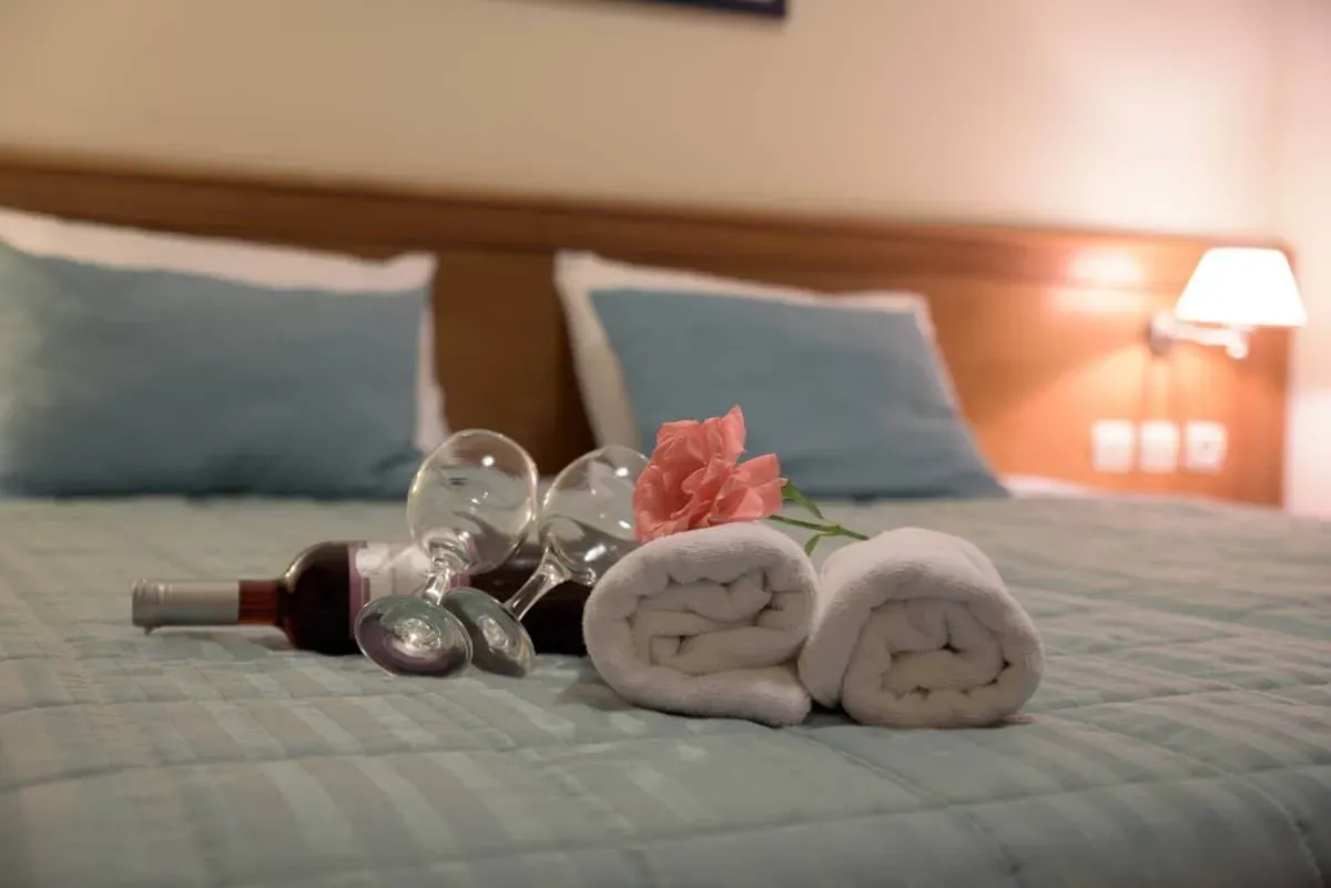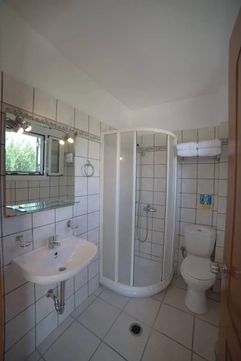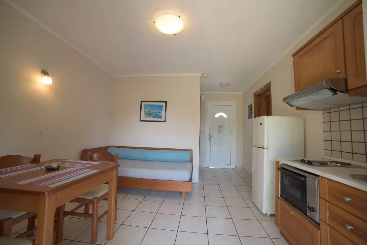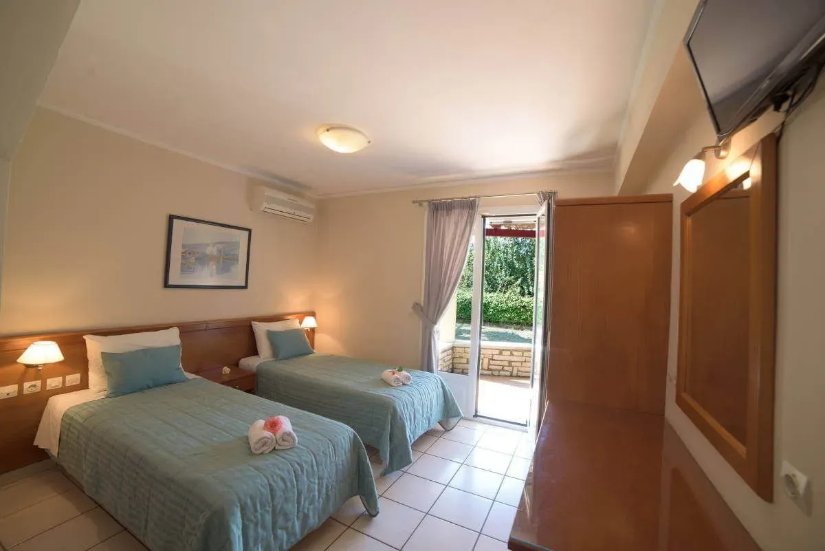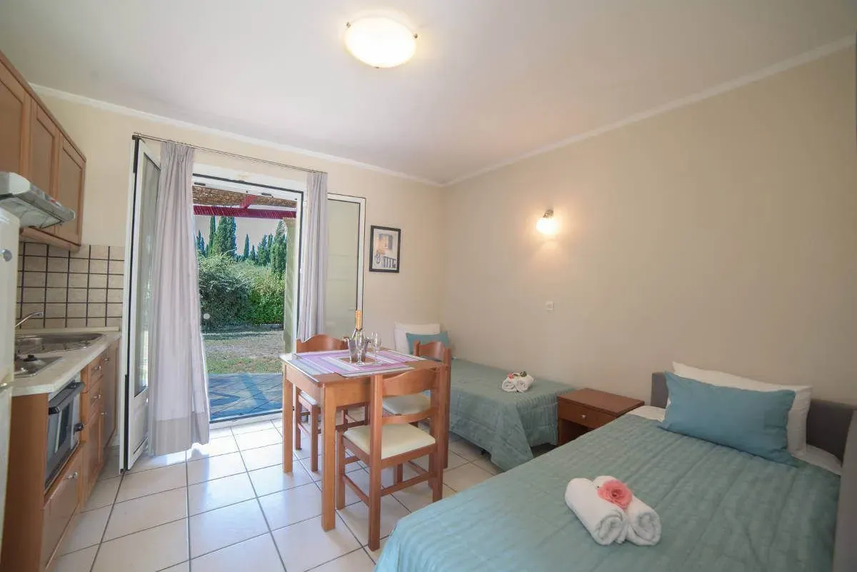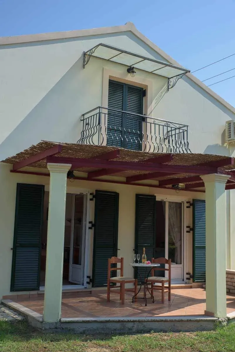 All of them come with a fully equipped kitchen, dinning table, large fridge, air-condition and television/satelite in the bedroom, spacious closets, anatomic mattresses, spacious WC with enclosed shower, hair dryer, iron with iron board (if you ask for it), double glass windows with mosquito nets, private porch with view at our lovely garden.